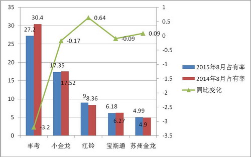 一、2015年8月考斯特客车销售数据分析-考斯特客车市场老大丰考销量及市场占有率同比均下降