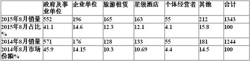 按照目标市场用途划分,2015年8月及2014年同期比较各细分市场的销量及市场份额如下表: