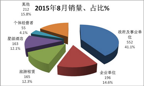 2.企业单位:外资、合资、大型国企、民营企业等用于接待、员工福利用车,占市场14.6%(同比上升0.45个百分点)。