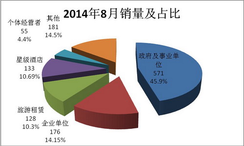 5、个体经营者购买55辆,占比为4.1%(2014年8月份此细分市场销量也是55辆,占有率为4.4%),同比下降了0.3个百分点。