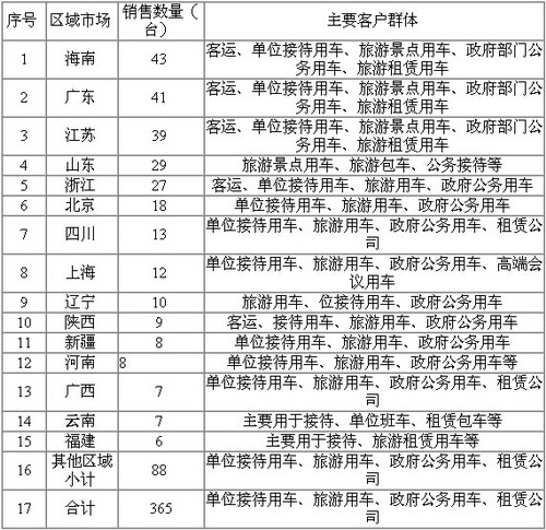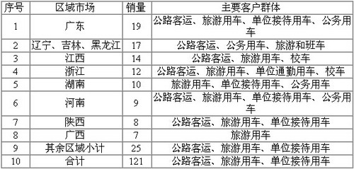 (二)、江铃考斯特:江铃考斯特2015年8月销量121台,销售区域在广东、东北、江西、浙江等区域市场,目标客户群体主要是旅游客运和公路客运。