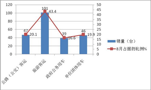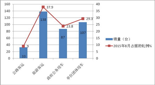 2015年8月份,国产品牌中最大销量的小金龙考斯特,主要细分市场用于旅游客运领域,其次是公路(公交)客运领域,再次是单位团体客车领域,政府公务用车领域为最少,主要原因是三公费用得到了限制,公款旅游市场受到了制约。