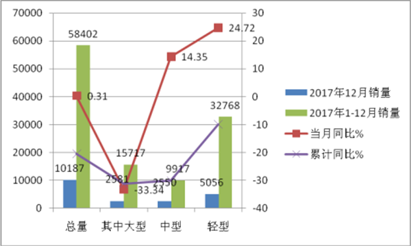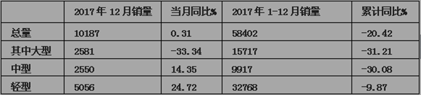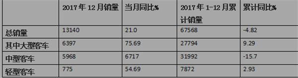 根据中通客车最新产销快报,2017年12月及1-12月销售数据: