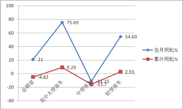 3、在中型客车市场,销量只占据总量22.8%的权重,是最小的细分市场,但降幅较大,达到42.8%的幅度,也是唯一下降的细分车型。