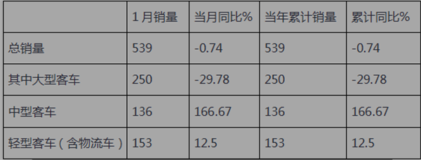 2月7日,中通控股股有限公司(以下简称“中通客车”)发布2018年1月产销快报。快报显示,中通客车2018年1月销量环比、同比均出现下降,环比下降较大,同比轻微下降。具体销量是539辆,环比2017年12月下降81.7%,同比微降0.74%,按车型划分具体销量如下: