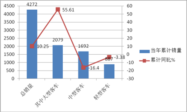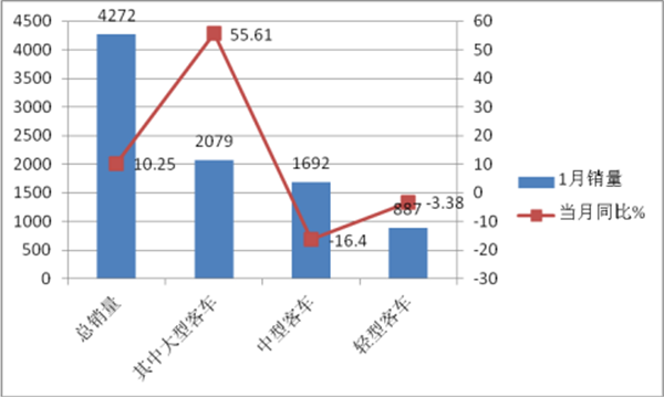 1、 宇通客车1月客车销量同比增长10.25%,其中大型客车同比增幅为55.61%,是大中轻客车细分市场中增幅最大的车型。彰显了宇通客车一如既往的实力。中型客车和轻型客车同比增幅为负值。