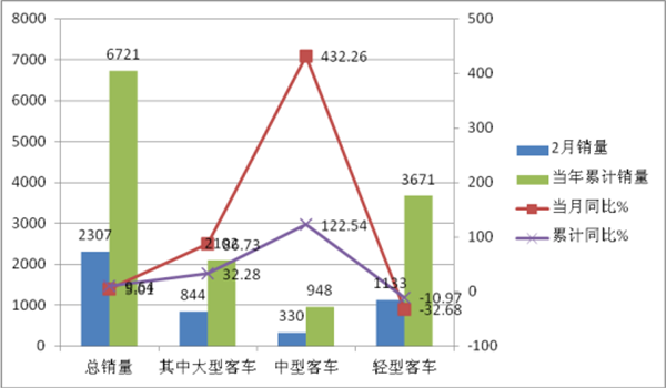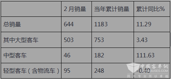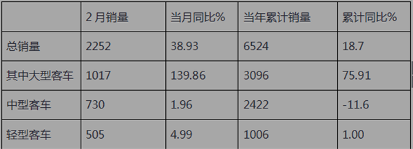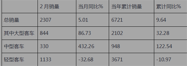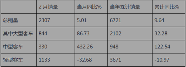 根据福北汽福田汽车股份公司近期发布的产销数据,2月客车销量如下表: