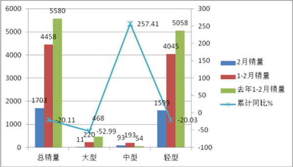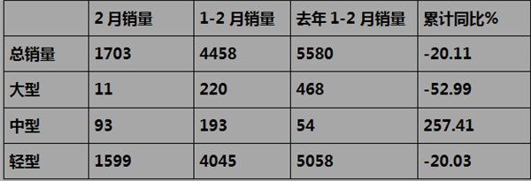 2、 2月大型客车销量只有11辆,1-2月累计销量同比下降近53%,是下降幅度最大的细分车型。