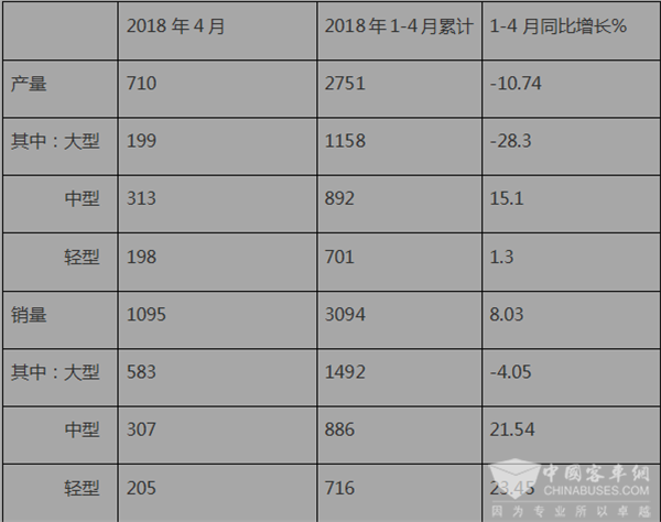 根据厦门金龙汽车集团股份有限公司董事会5月5日发布的产销快报,2018年4月及1-4月金龙汽车客车产销数据表:
