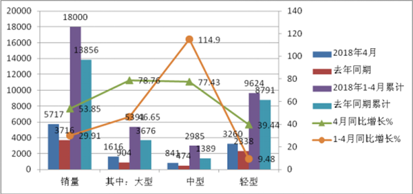 大型客车4月销量同比增长76.78%;中型客车同比增长99.58%,为细分车型中增幅最大。轻客同比增幅39.44%,是细分车型中增幅最小的车型。1-4月中,中型客车增幅为114.9%,为最大的细分车型。最小的是轻型客车,同比增幅为9.8%。