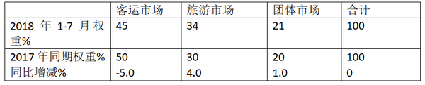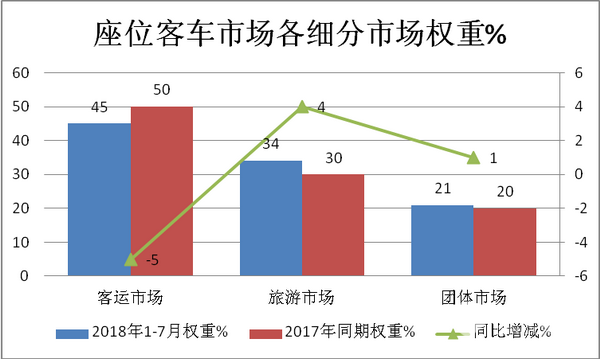 可见,2018年1-7月的座位客车市场中,尽管总体下降,但从内部组成的细分市场结构看,只有客运市场同比权重下降,旅游和团体客车市场权重同比均为正增长。