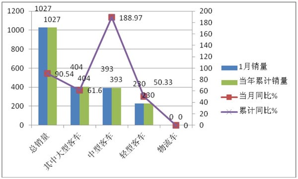 1、 宇通客车1月客车销量同比增长23.24%,其中大型客车同比增幅为0.19%,是大中轻客车细分市场中增幅最小的车型。中型客车和轻型客车同比增幅均超过4成,分别为43.91%和 49.1%。