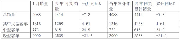 2019年2月2日,厦门金龙汽车集团股份有限公司披露产销数据快报,公司2019年1月份客车销量为4088辆,同比下降7.3%,具体数据如下表: