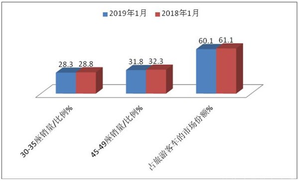 按座位数来细分旅游客车市场,30-35座、45-49座左右的旅游客车受旅游市场青睐,市场集中度达到60.1%,比2018年同期低出1.0个百分点;30-35座产品市场份额比2018年同期下降0.5个百分点,45-49座的产品市场份额比2018年同期也下降0.5个百分点。根据对目标用户的调查,旅游团分为大团和小团,一般大团在47人左右,小团在33人左右,所以,旅游客车主要集中在10-11米、11-12米、8-9米和7-8米等长度段上, 2019年1月旅游车30—35座与45-47座位销量、比例情况与2018年同期比情况如下表:
