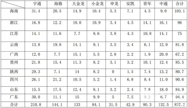 2、 在上述所列的10个主流区域市场中,作为第一旅游大市场的海南,垄断程度最高,旅游客车市场竞争最不充分,其中宇通市场份额接近三分之一,海格客车市场份额接近四分之一,大小金龙的市场份额也不低,可以说,海南旅游客车市场基本是三龙一通的天下。