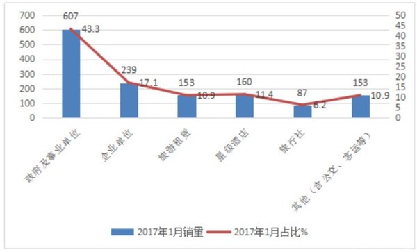 3、从近4年1月销量曲线看,政府事业单位销量占比一直呈现下降态势,但权重仍然最大。