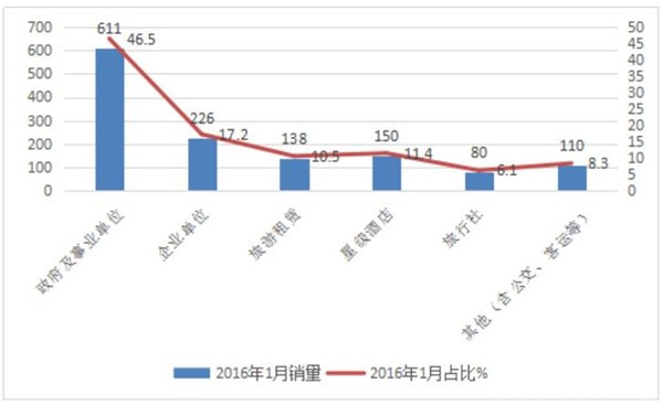 1、政府及事业单位是1月考斯特客车销量占比最大的客户,但同比权重下降0.8个百分点,下降幅度最大。