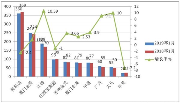 1、自主品牌中厦门金旅和江铃考斯特表现尚可,2019年1月分别销售249辆和188辆,与2018年同期相比分别增长1.6%和10.59%,销量分别是国产品牌中最大和第二,