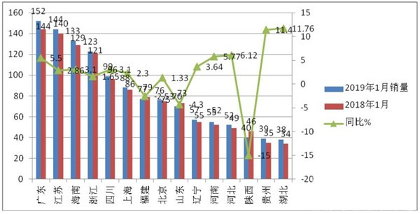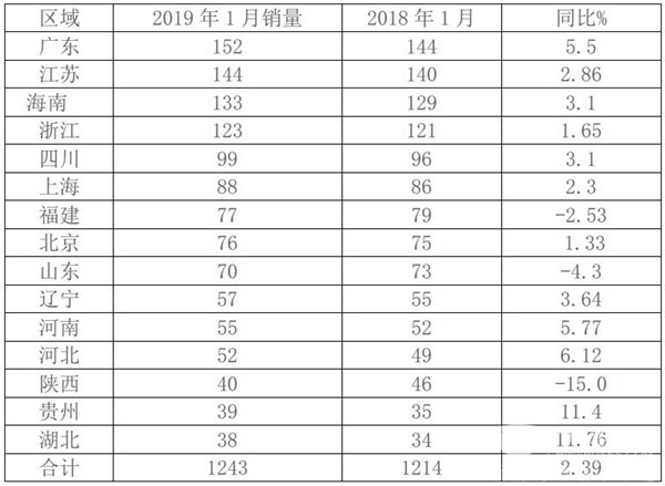 2019年1月各区域市场销量增幅统计%(来自上牌数据统计计算):