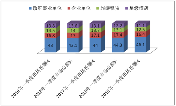 特征一、政府事业单位份额最大,但和企业市场份额同比均下降,旅游租赁行业和星级酒店行业市场份额连续上升