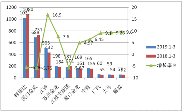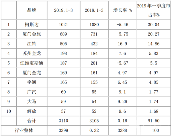 根据统计,2019年一季度考斯特客车累计销售3399辆,同比微增0.32%。具体分析有如下市场特征: