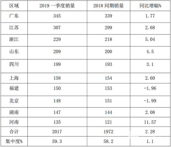 2、前10名重点区域市场销量集中度为59.3%,同比增加1.1个百分点,垄断程度有增强趋势。