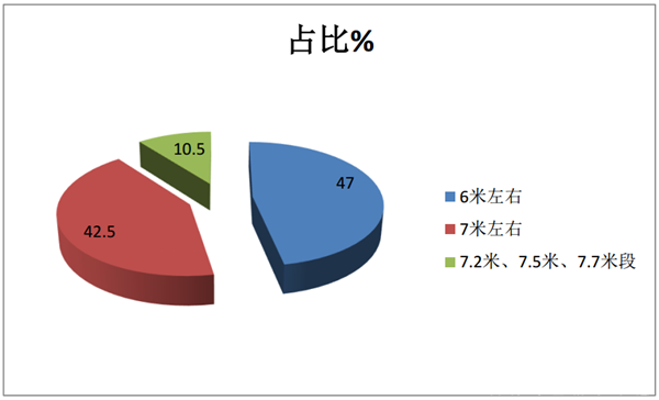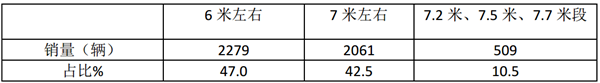 可见,6米长度段考斯特客车销量占比最大,其次是7米段,再次是7.2米、7.5米和7.7米段。
