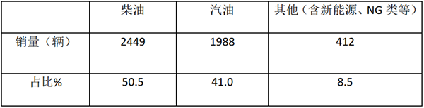 可见,在6米考斯特车型中,柴油发动机销量占据主导地位,超50%,其次是汽油,最小的是纯电动和NG类。