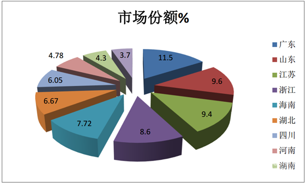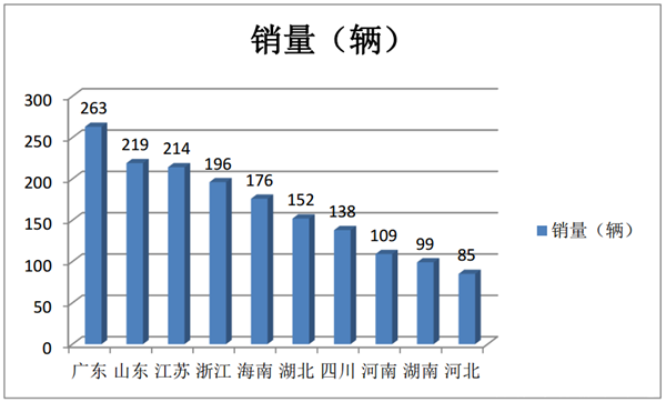 可见,广东区域市场6米考斯特客车销量最大,其次是山东和江苏。前10名重点区域市场集中度为72.32%,区域市场分布不均。