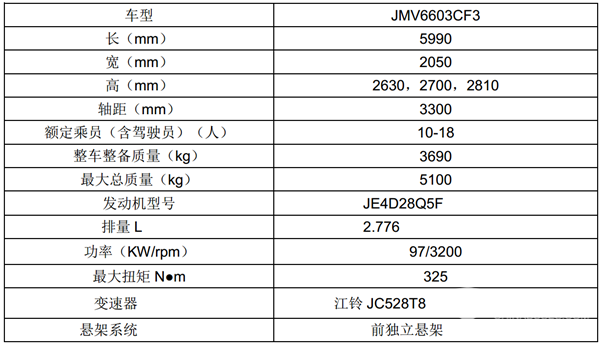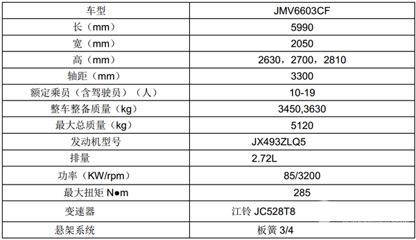 2、江铃晶马6米考斯特客车JMV6603CF---小型中级(小型高一级JMV6603CF3或JMV6603CF1是独立悬架,但只能装18座),最大座位数:19座;悬架:板簧,价格大约在20万左右,主要配置如下: