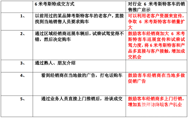 在与主流企业6米考斯特客车的区域市场经理沟通中,得知目前6米考斯特主要是通过以下途径达成销售成交: