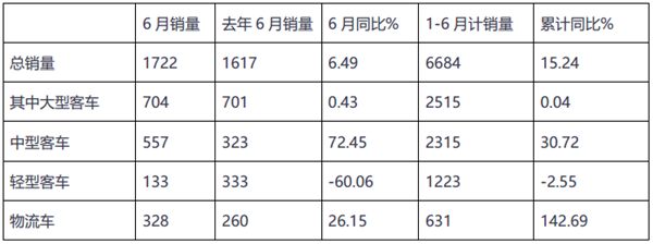 1、6月具体到细分车型销量数据来看,其大型客车销售704辆,同比增长0.43%;中型客车6月销售557辆,同比增长72.45%;轻型客车6月销售133辆,同比下降60.06%。中型客车表现较好,轻型客车表现较弱,纯电动物流车表现较好。