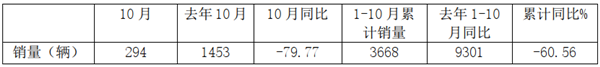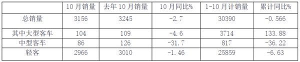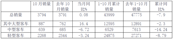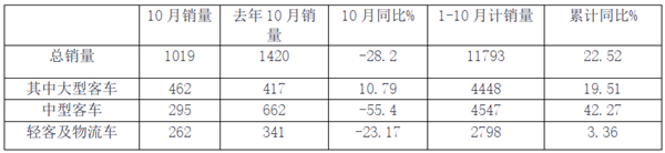 1、10月销量同比下降28.2%,结束了前几个月一直大幅度增长的局面,主要是在新能源客车补贴过渡期结束,整个客车市场大环境低迷导致。