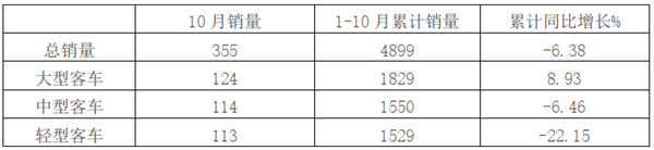 根据宇通客车公司11月5日发布的数据,2019年10月及1-10月销量如下: