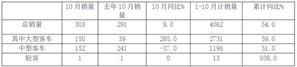 根据亚星客车11月6日发布的公告,2019年10月及1-10月销量数据: