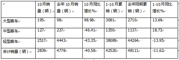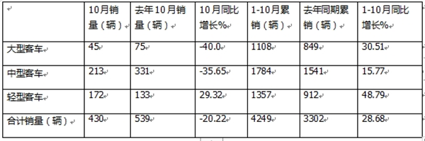 由于比亚迪产销快报未将客车销量按大中轻车型进行具体分类,因此未知其今年10月及1-10月大中轻客车各细分市场具体销量及同比增长情况。总之,比亚迪客车今年10月销量同比下降37.52%,前10月累计销量同比增长7.04%。