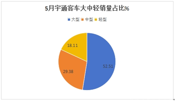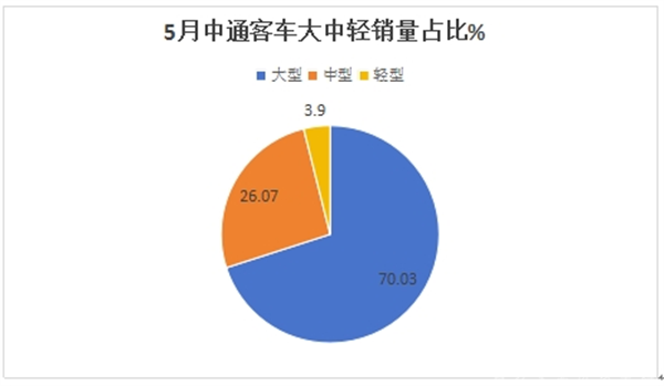 ---从产品销售结构来看,今年5月份,中通大型客车销量最多(占比70.03%)领跑各细分市场;是中通客车市场的绝对主体部分;中型客车销量占比26.07%居第二;轻型及物流车占比3.90%,居最少;