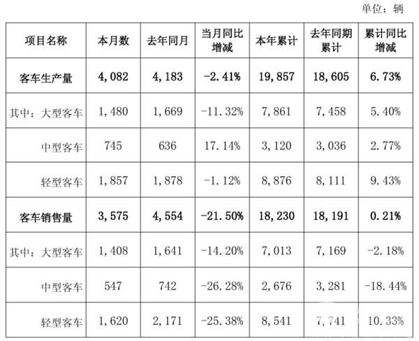 三、金龙汽车---销3575辆降21.5%,大中轻客车同比全线下滑