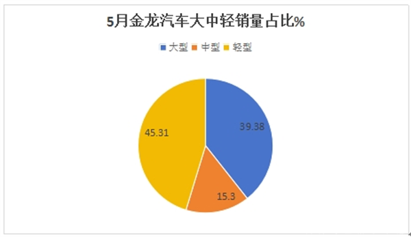 ---从产品销售结构来看,今年5月份,金龙汽车轻型客车销量最多(占比45.31%)领跑,成为今年5月金龙汽车市场的主体部分;大型客车销量占比39.38%居第二,中型客车占比15.30%,居最小;