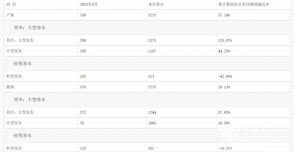 近日,中通客车发布了2025年5月份产销数据快报。