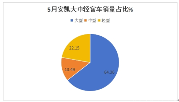 ---从产品销售结构来看,今年5月份,安凯大型客车销量最多(占比64.36%),成为今年5月安凯客车市场的绝对主体部分;中型客车销量占比13.49%居第二;轻型客车占比22.15%,居最少;