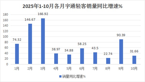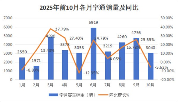 根据宇通产销快报数据,2025年1-10月各月宇通客车销量及同比: