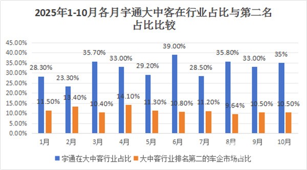 上图表可见,2025年1-10月,宇通在我国大中型客车行业的市场占比大部分月份都在3成以上,甚至接近4成,且一直都排行第一;