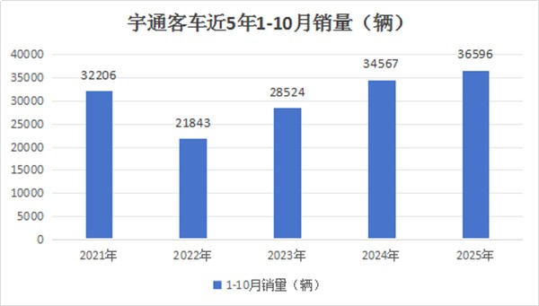 上图可见,2025年1-10月宇通客车累计销量36596辆,创下近5年同期最高,因此成为2025年前10月宇通客车销量的一个突出特点。