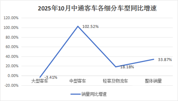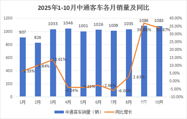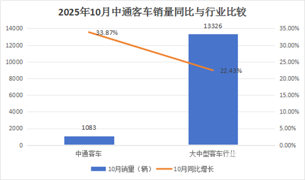 根据中国客车统计信息网数据,2025年10月中通客车销量同比增长33.87%,跑赢今年10月6米以上大中型客车行业22.43%的同比增速近11.44个百分点。