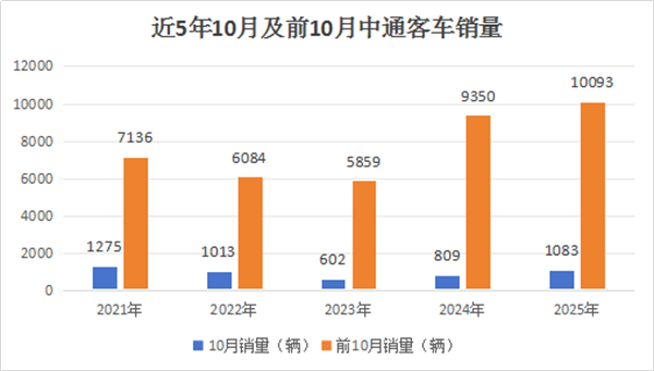 上图可见,2025年10月及1-10月中通客车销量分别为1083辆和10093辆,分别居近5年同期第二和第一。