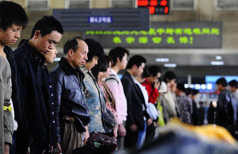 5月19日14时28分,在沈阳北站候车室,旅客、客运职工向汶川大地震遇难者默哀。