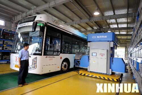 7月17日,一辆奥运电动公交客车正在充电。据介绍,从7月20日起,50辆由我国自主研发的零排放电动公交客车组成的奥运电动车队将在奥运中心区分5条线路运营,为参加北京奥运会和残奥会的媒体、运动员和技术官员服务。