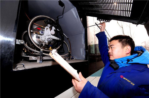 ▲上图为公交站工作人员在做车辆检查