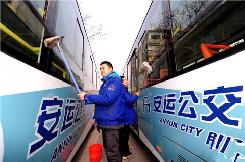 ▲上图为工作人员在对车辆进行发车前清洁